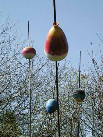 Künstlerische Skulpturen und bewegliche Objekte (Windspiele) ziehen die Blicke neugierig an.